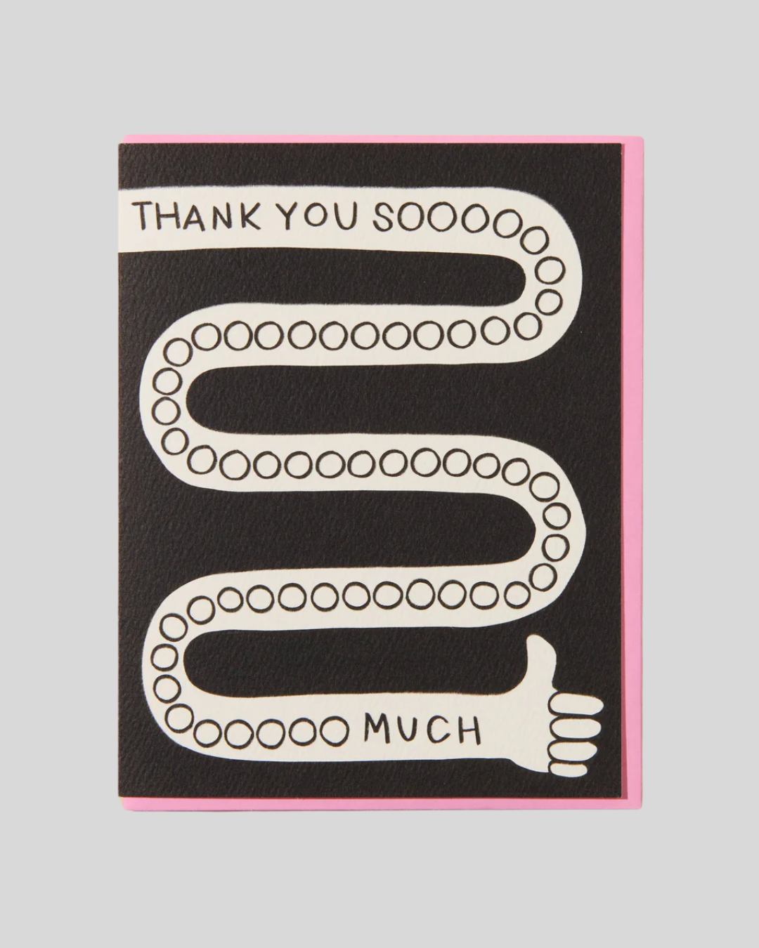 Thanks soooooooooooooooo much! • Card reads: "Thank you soooooooooooo much" • Folded card measures A2 (4.25″ x 5.5″) • Comes with a coordinating envelope. • Digitally printed on natural, white textured paper. • Words and illustrations by Julia McCormick.