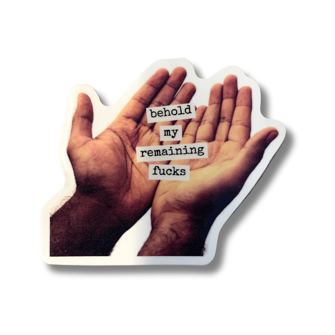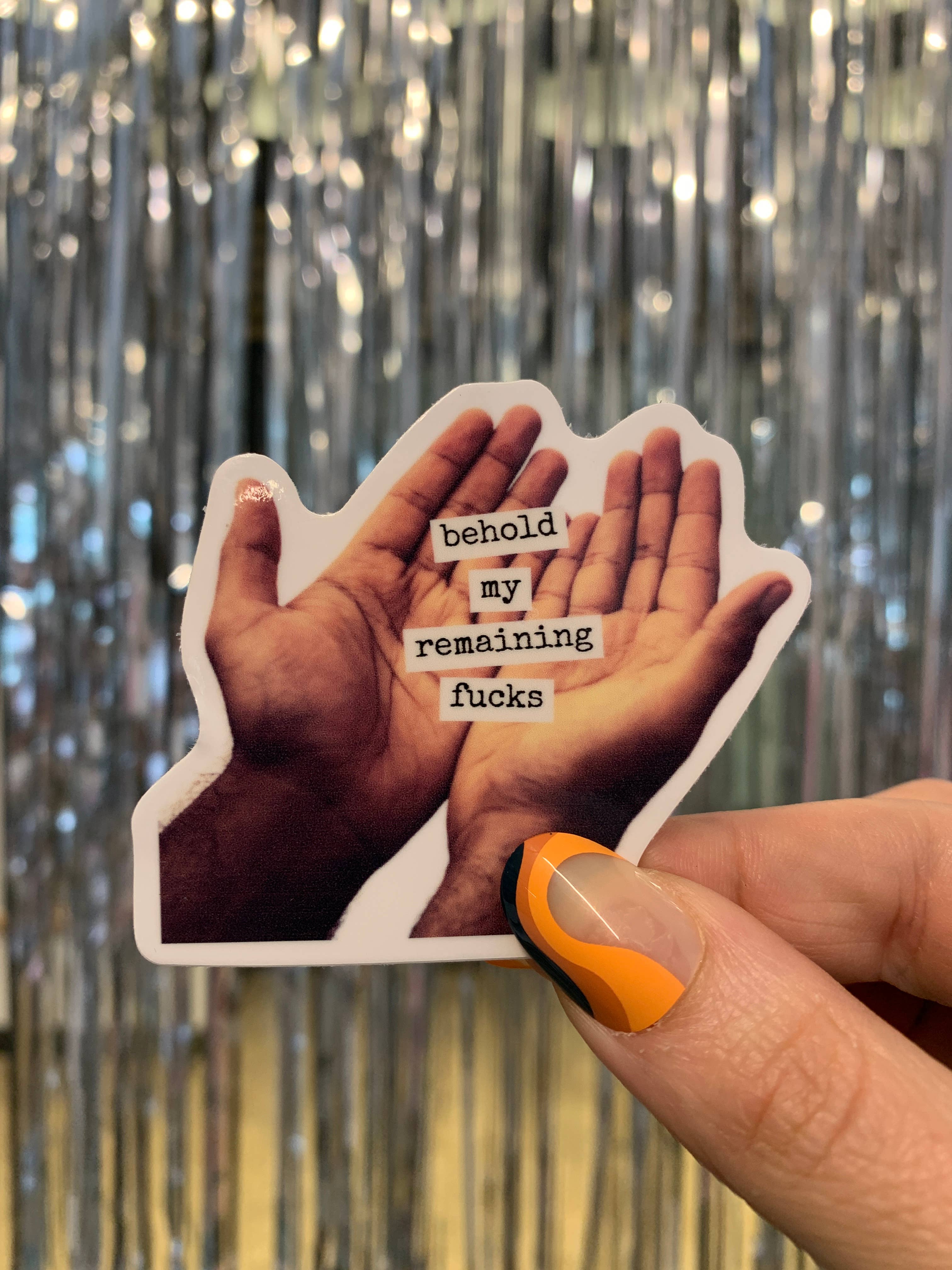 Sticker reads, "Behold My Remaining Fucks" Approx. 3.2" x 2" Themes: sweary, profanity, DGAF Our glossy finish protects stickers from harmful UV rays, so they will stay vibrant on laptops, water bottles, bikes, and more. Stickers have split backs for easy use. Comes unpackaged.