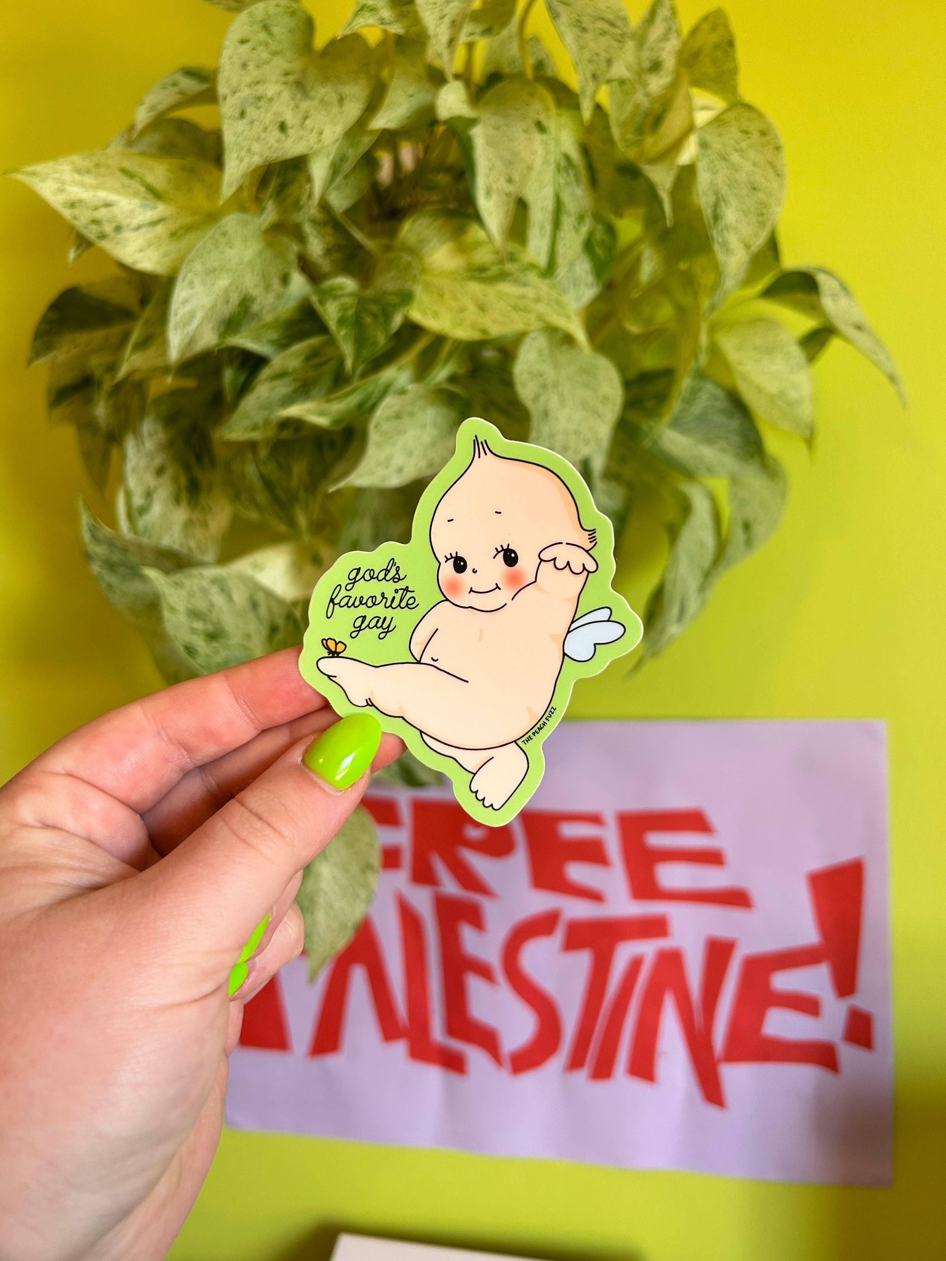 I mean look at you! How could you NOT be god's favorite?! You cutie patootie little angel. Embrace it! Vinyl water resistant sticker with matte finish. Measures 3.4 x 2.8 inches. Materials and Care: ✿ fully waterproof ✿ Feature UV screening to protect against weather and sunlight ✿ 2-4 year minimum outdoor life Perfect sticker for your laptop, water bottle, notebook, and even your car!