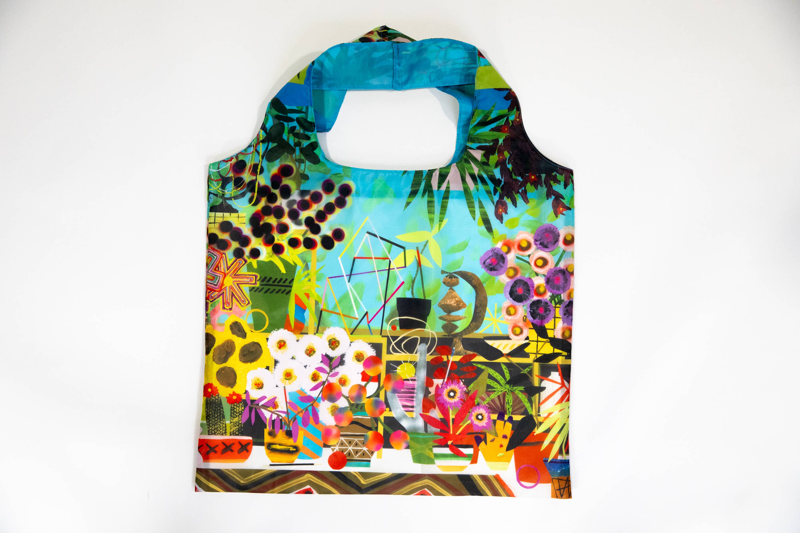 They are an easily packed and super useful companion for your grocery store trips, farmers' market runs, and beach days. This design, in particular, is perfect for anyone who loves surreal and colorful collage-style art.