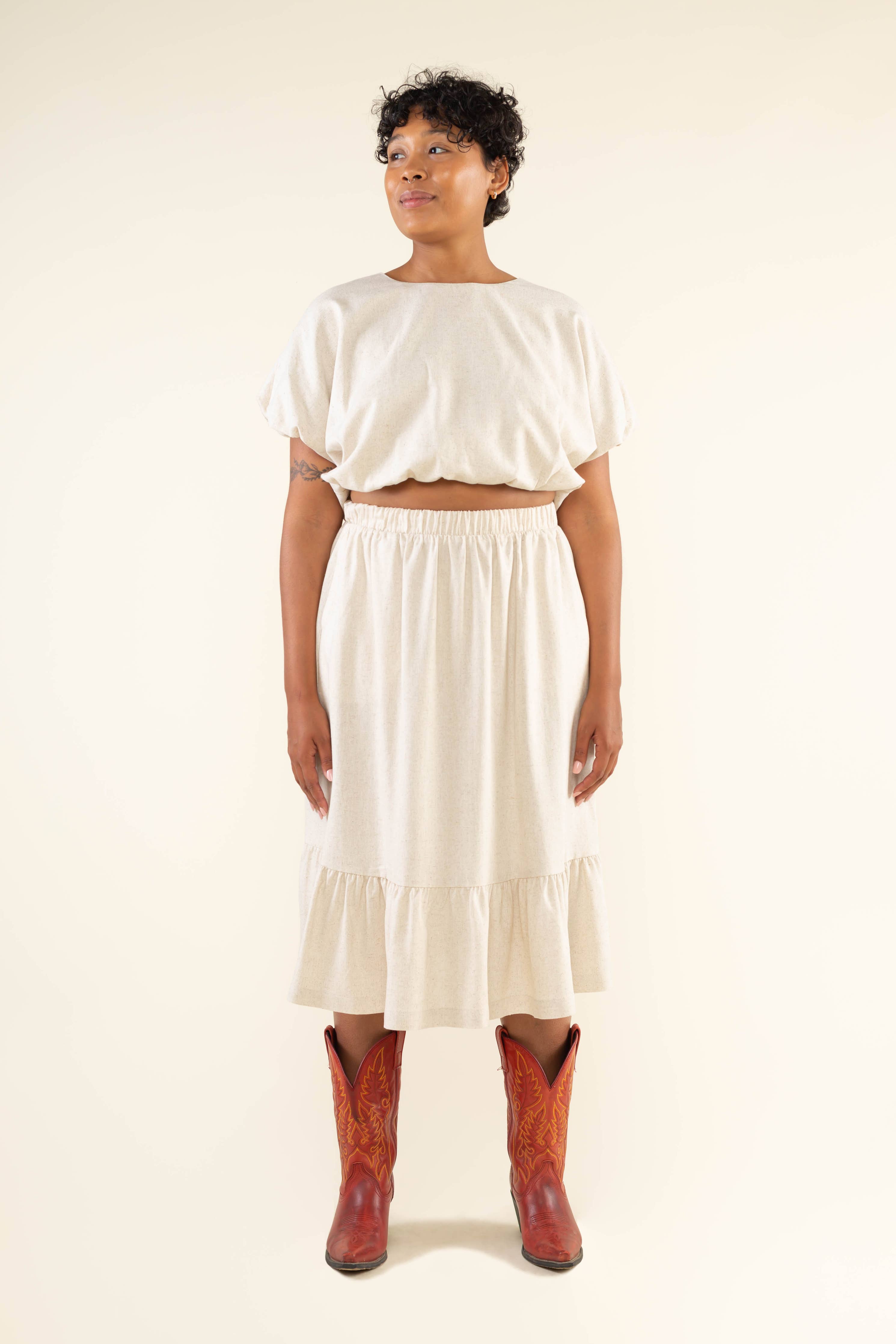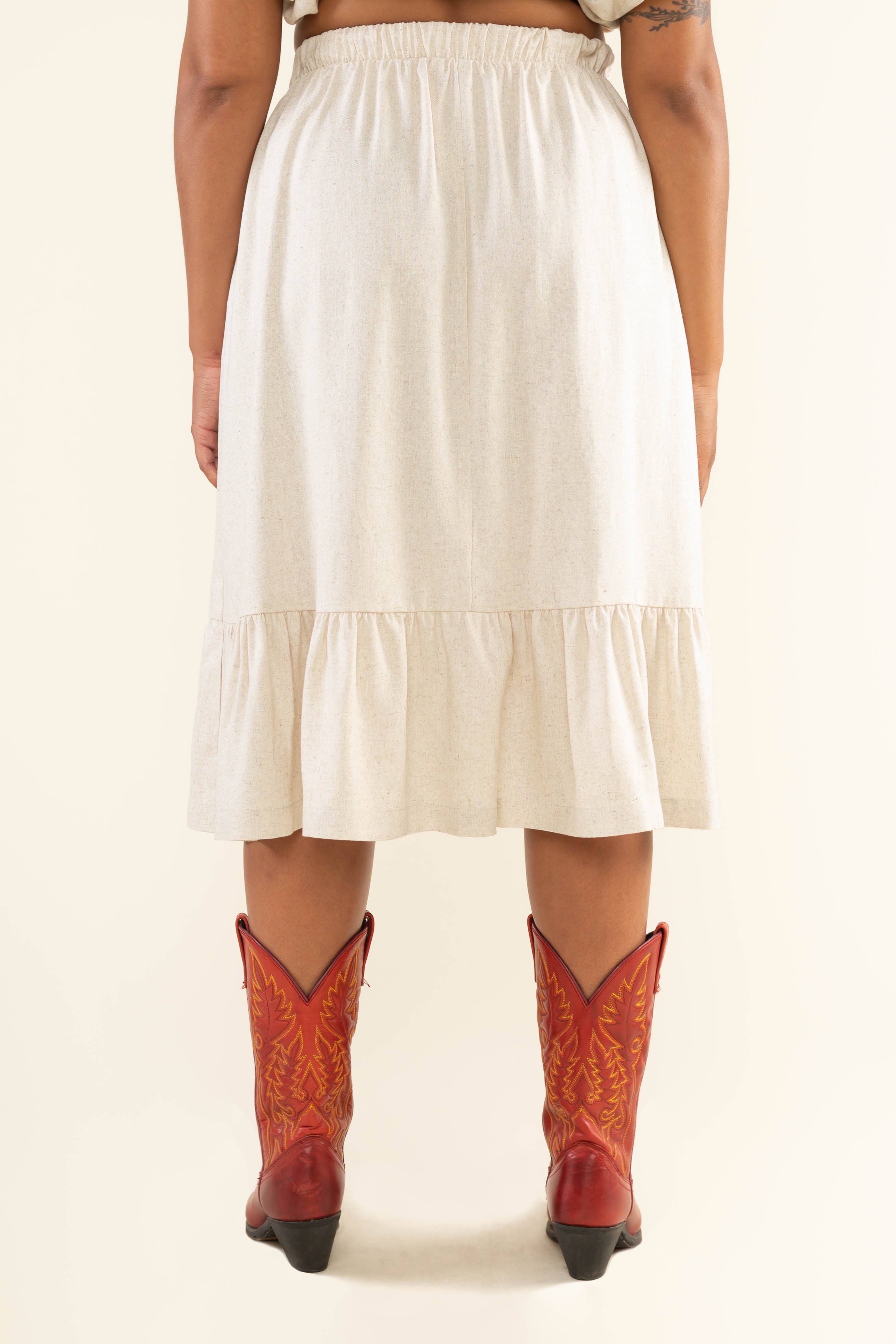 Knee-length skirt with elastic at waistband for comfortability and easy wear. Ruffle at the hem and side pockets.