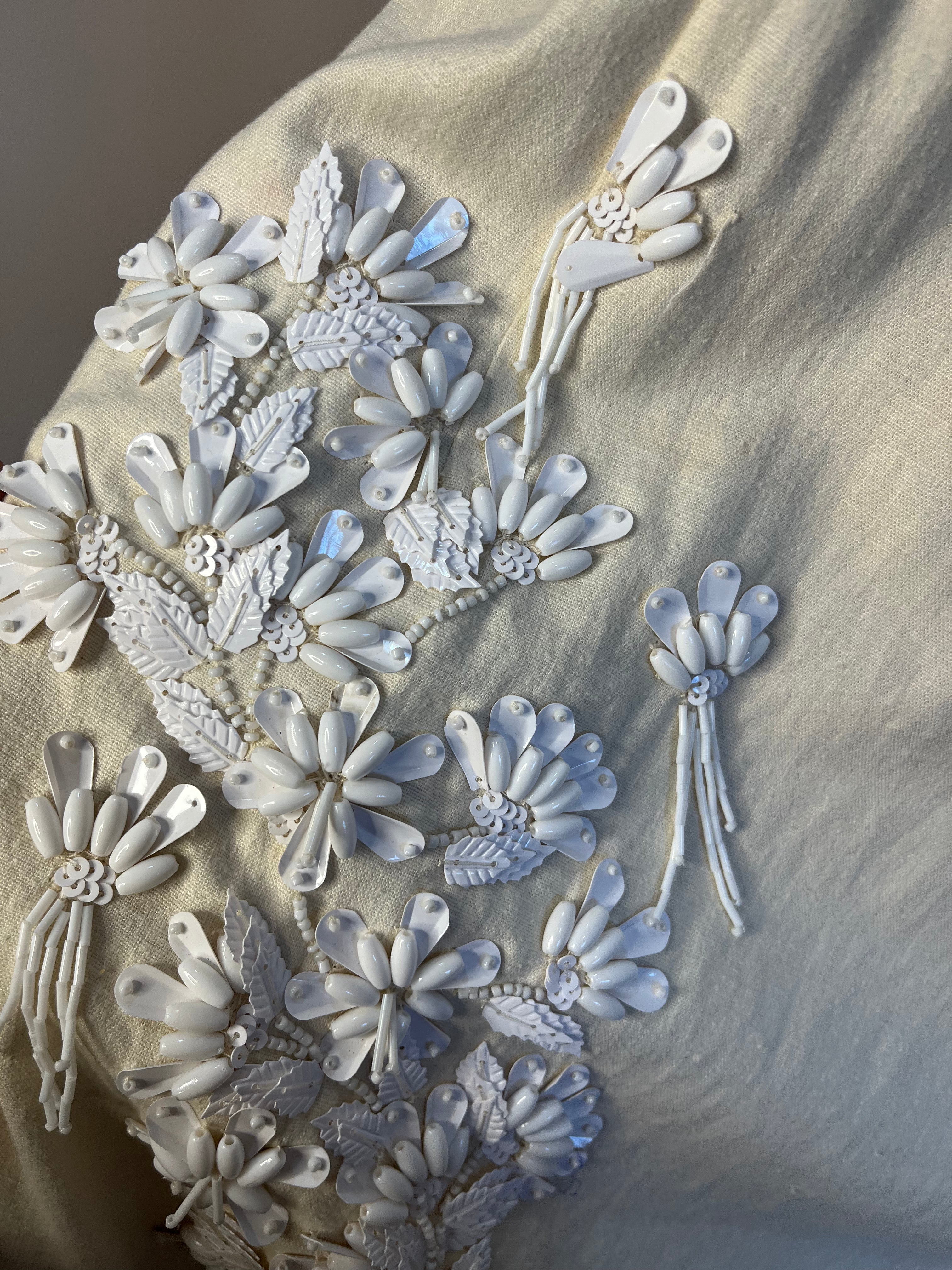 - Dress is midi length and features a square neckline. Fully lined with center back slit and 3D sequin embellishment. Hidden center back zipper