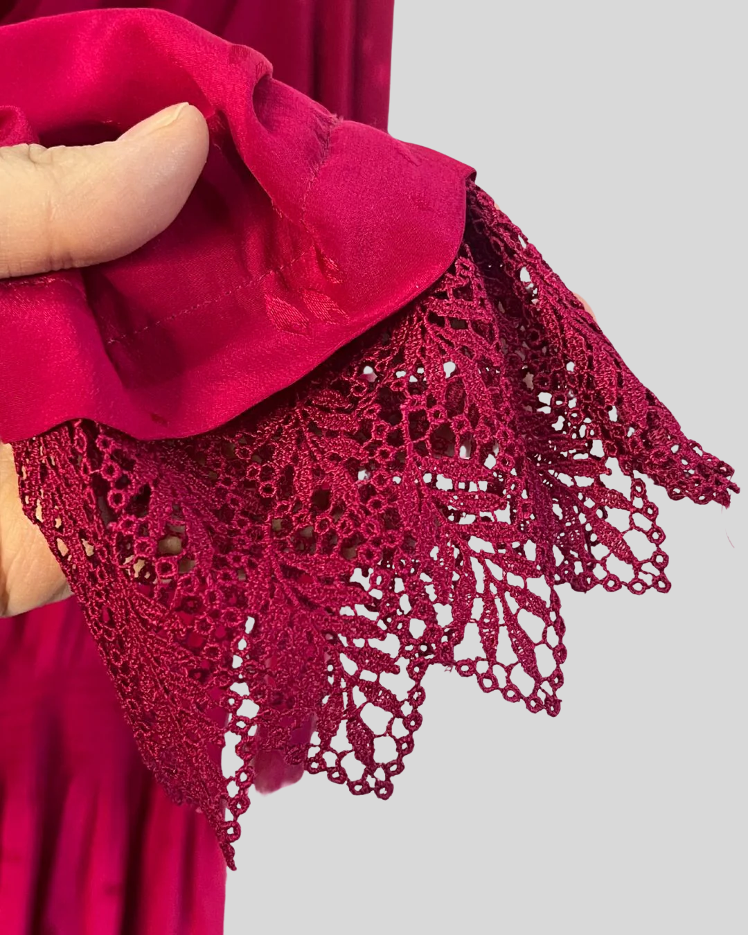 - Features a draped neckline, long sleeves with lace trim, a drop waist, and a pleated skirt with a lace hem
