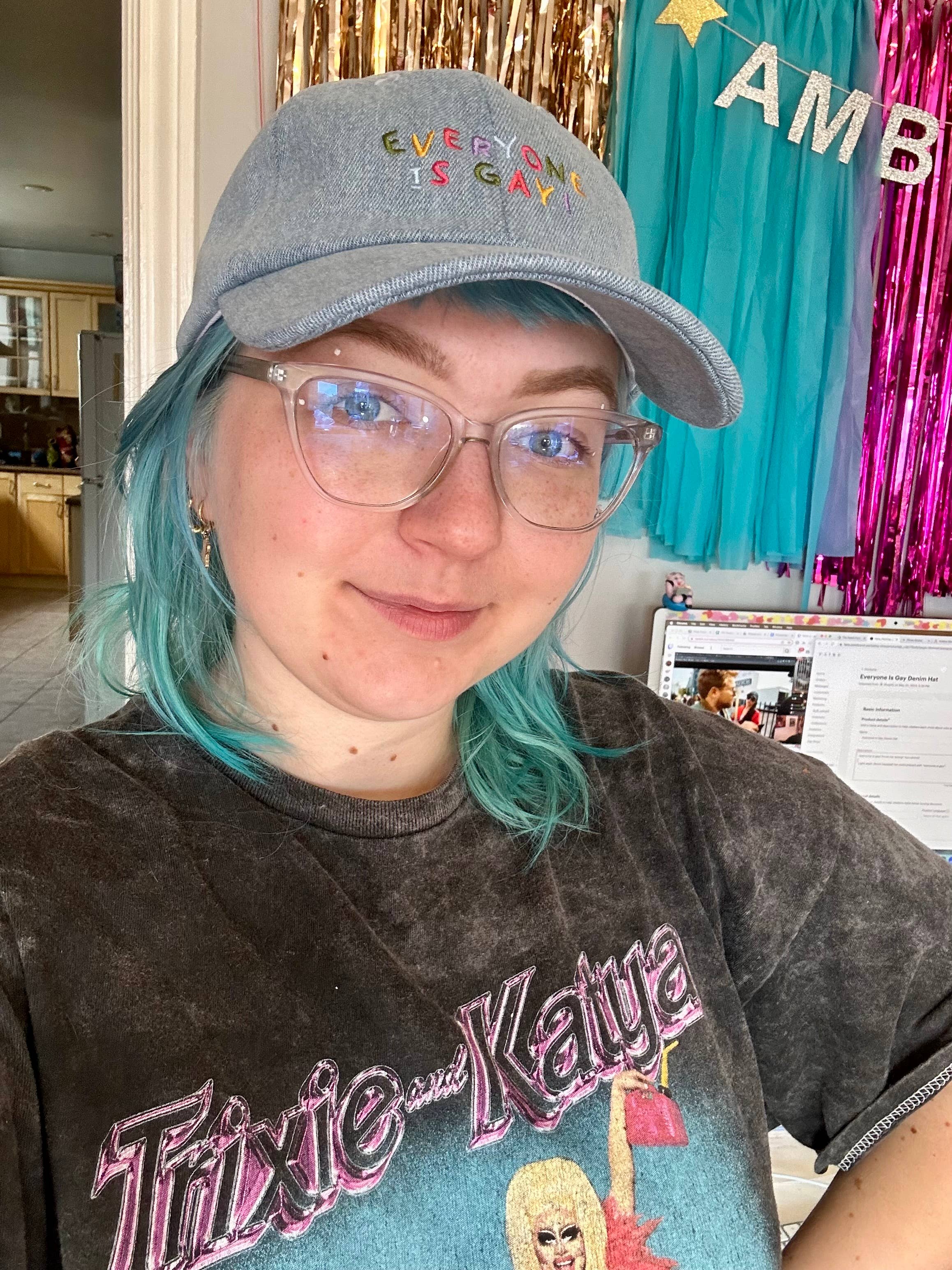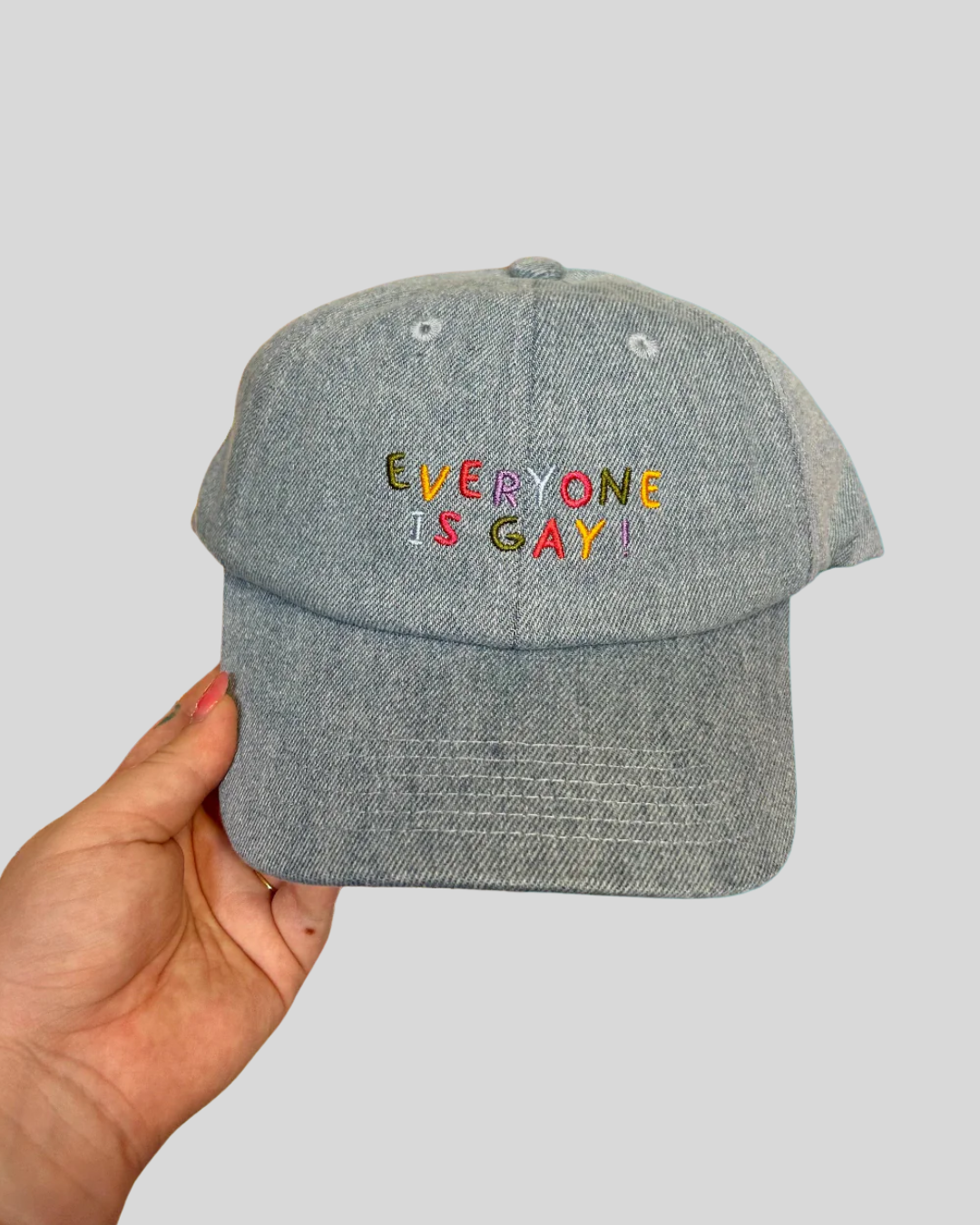 Everyone is gay! Prove me wrong! You cannot! Light wash denim baseball hat embroidered with “everyone is gay!”