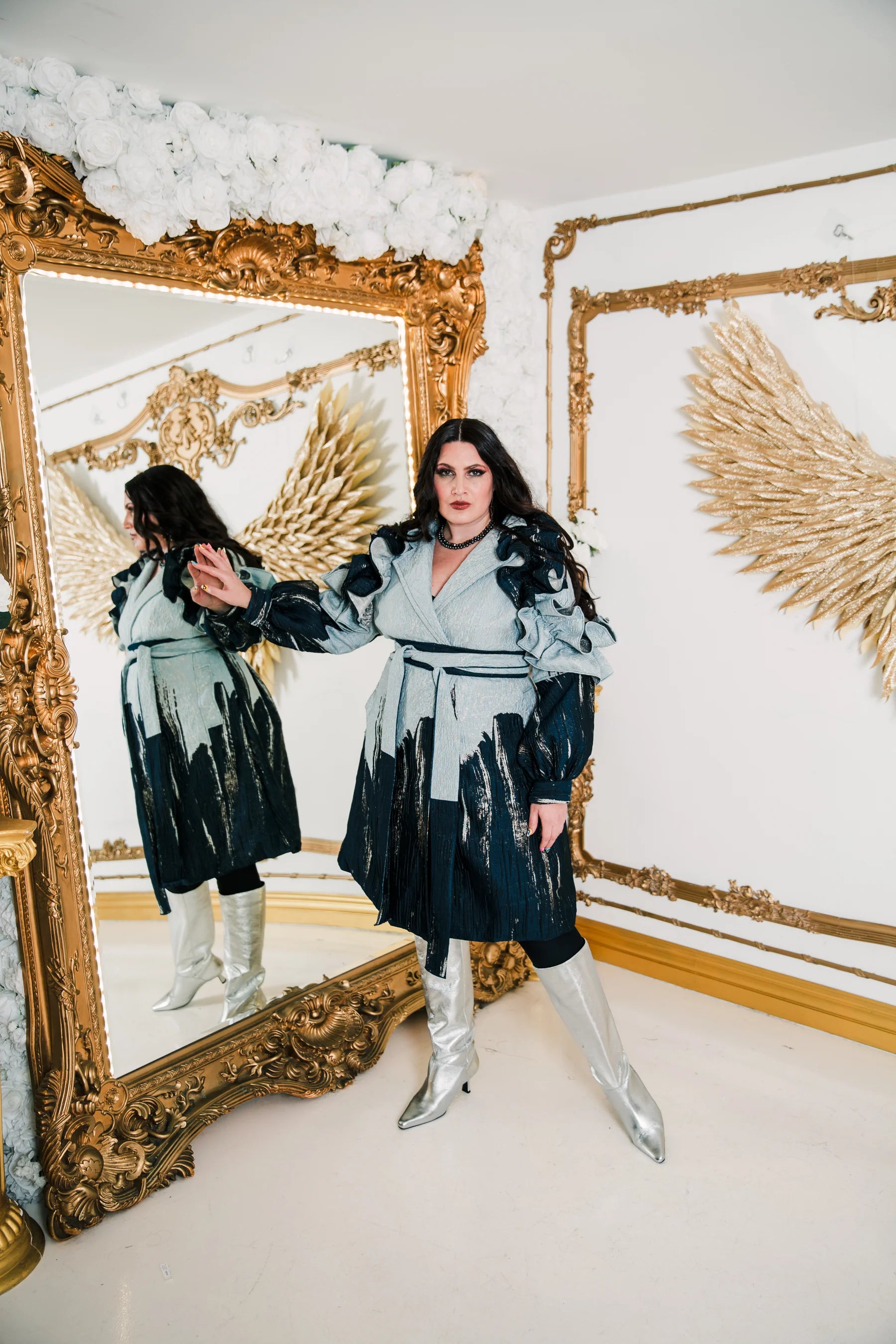 We’ve reimagined the classic trench coat silhouette and made it something unlike anything you’ve ever experienced with dramatic ruffles in place of traditional epaulets, a fused collar you can pop, and generous bishop sleeves. The soft shoulder allows for layering over your wardrobe staples with a self-tie belt you can easily adjust to your torso length. This theatrically inspired piece is perfect for walking down the street and having everyone truly see you!
