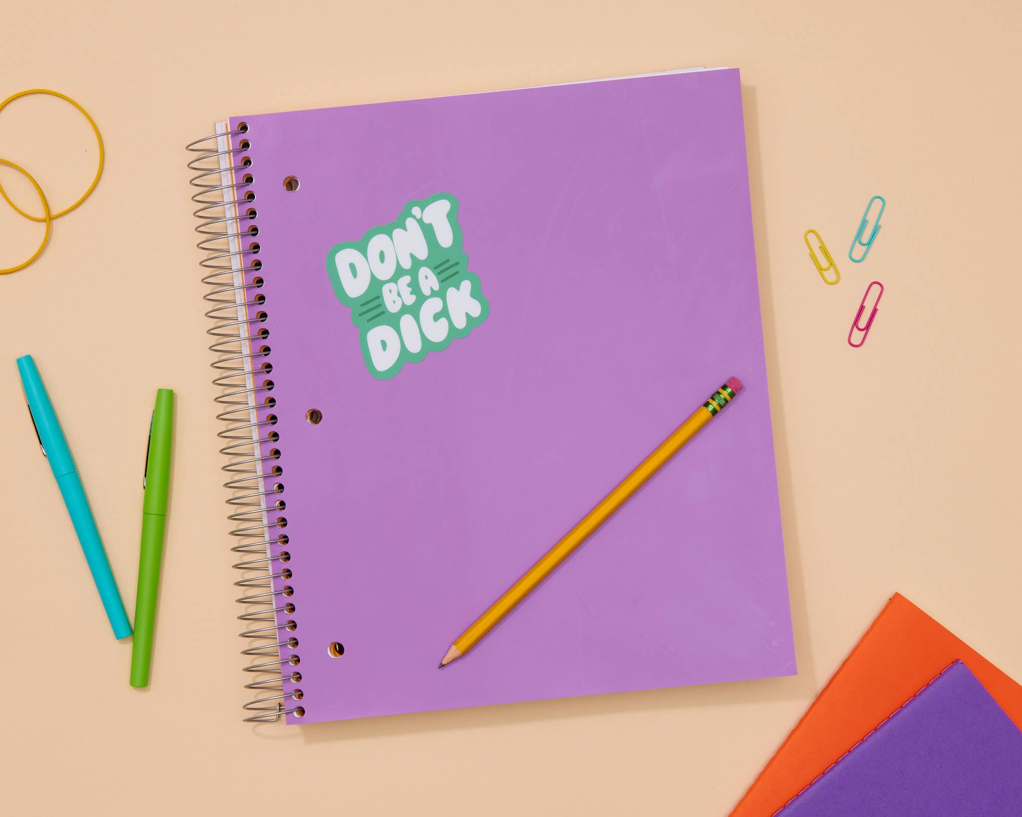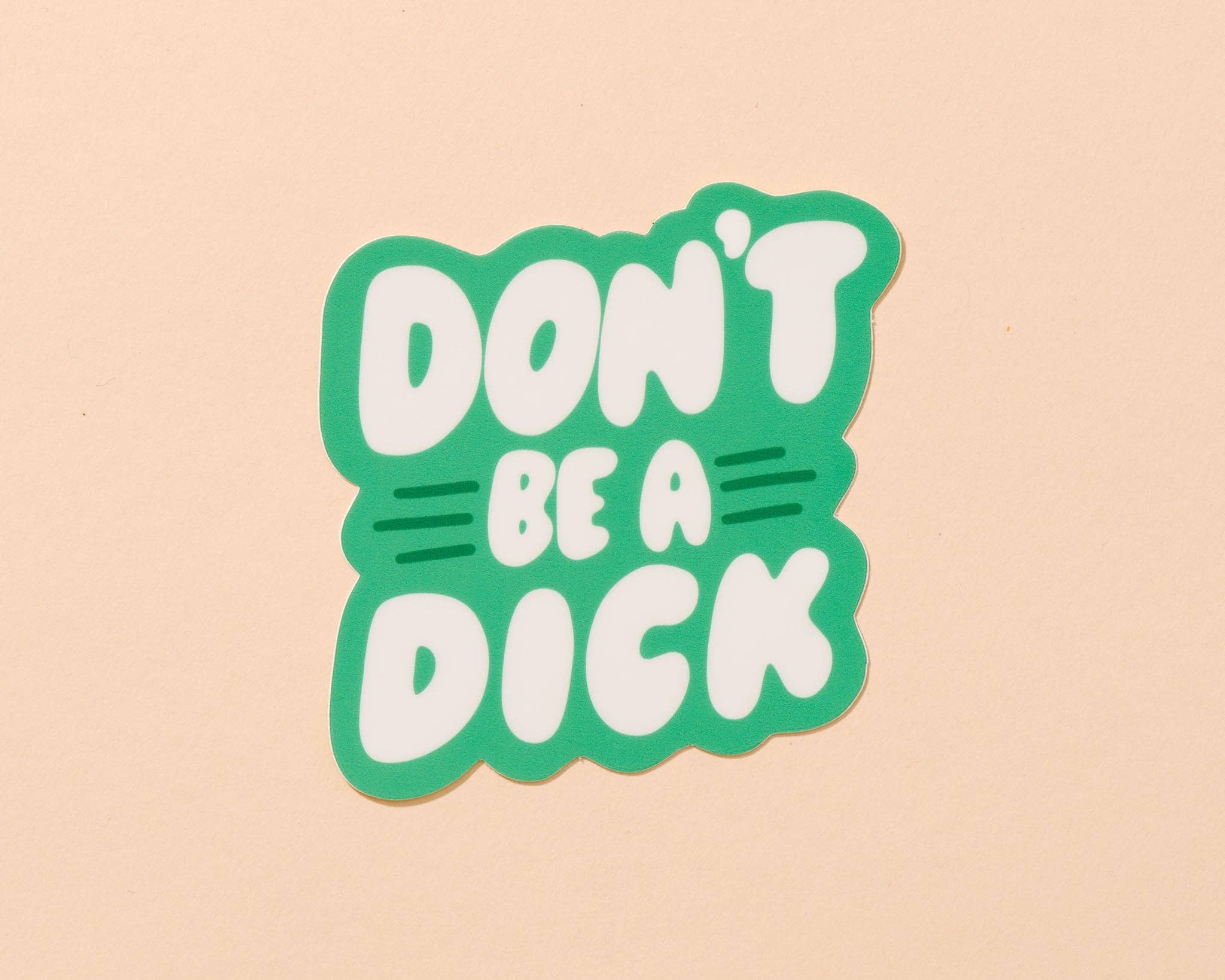 Don't be a dick is good for being the #1 house rule, office rule, coffee shop rule, entire globe rule. • Sticker reads, "Don't be a dick" • Die cut, vinyl sticker • Approximately 3" • Durable, waterproof, appropriate for outdoor use and dishwasher safe • Made in the US. • Artwork by Kiwi Schloffel - Your Gal Kiwi for And Here We Are