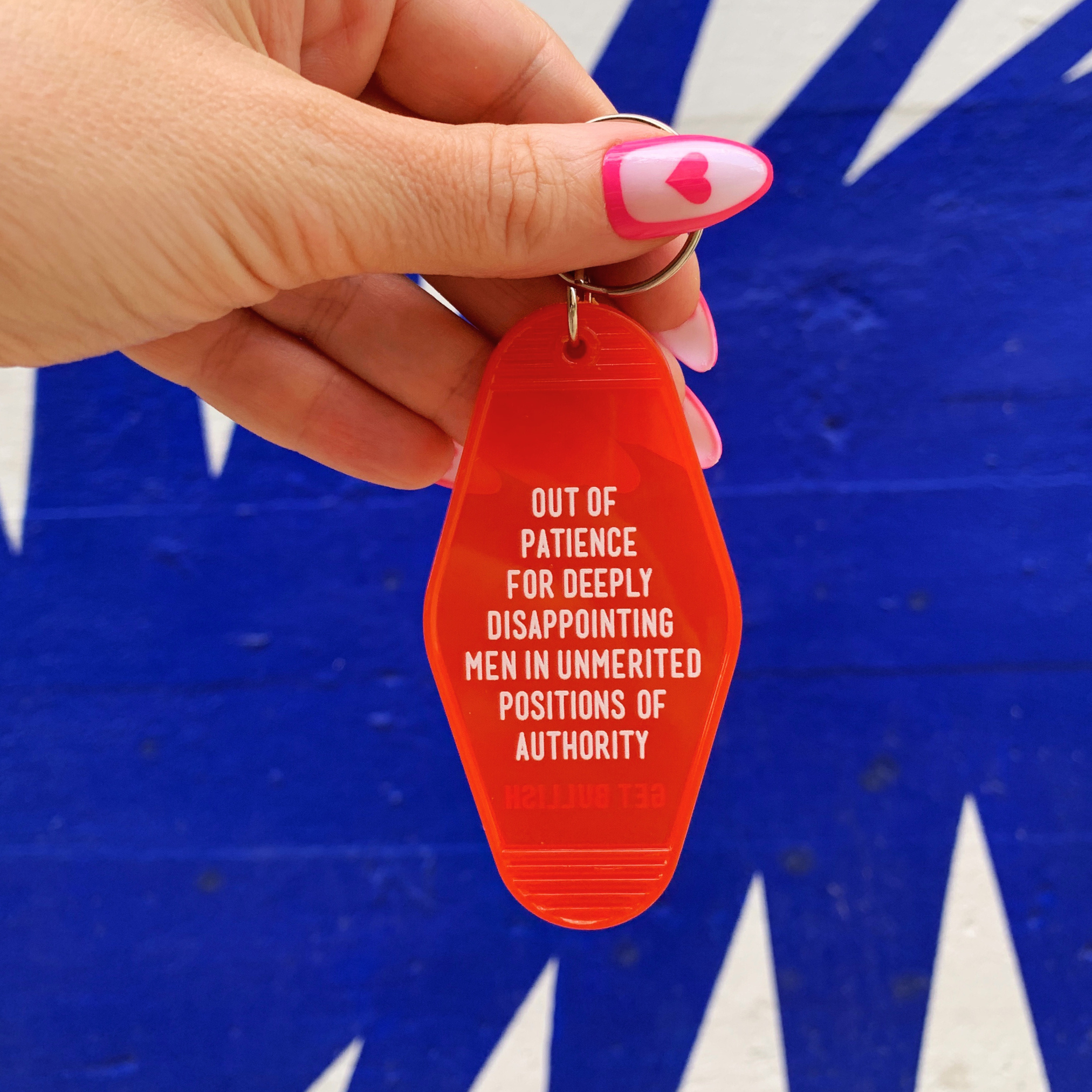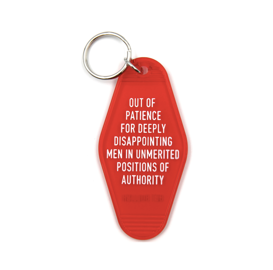 Red keychain reads: OUT OF PATIENCE FOR DEEPLY DISAPPOINTING MEN IN UNMERITED POSITIONS OF AUTHORITY in white lettering.